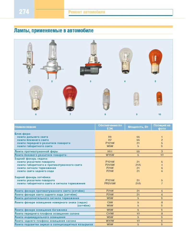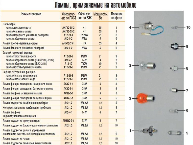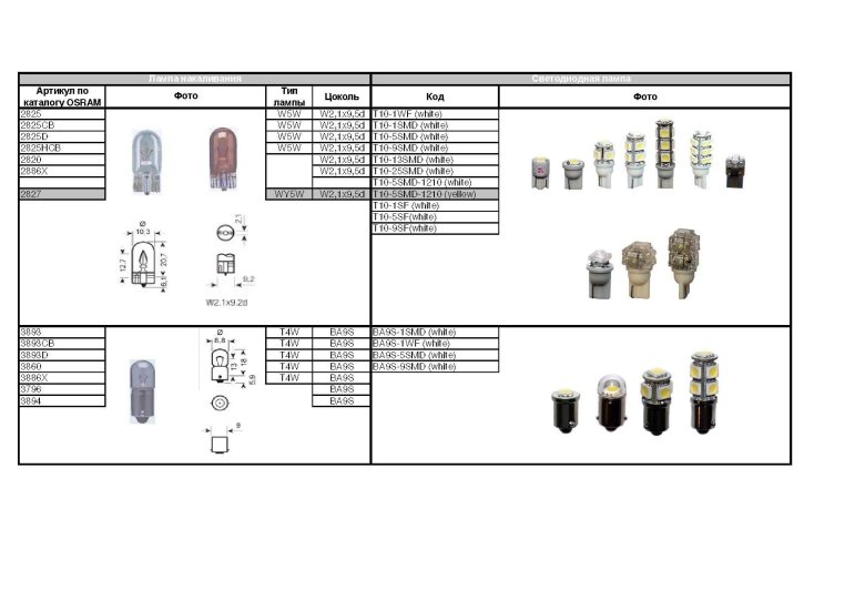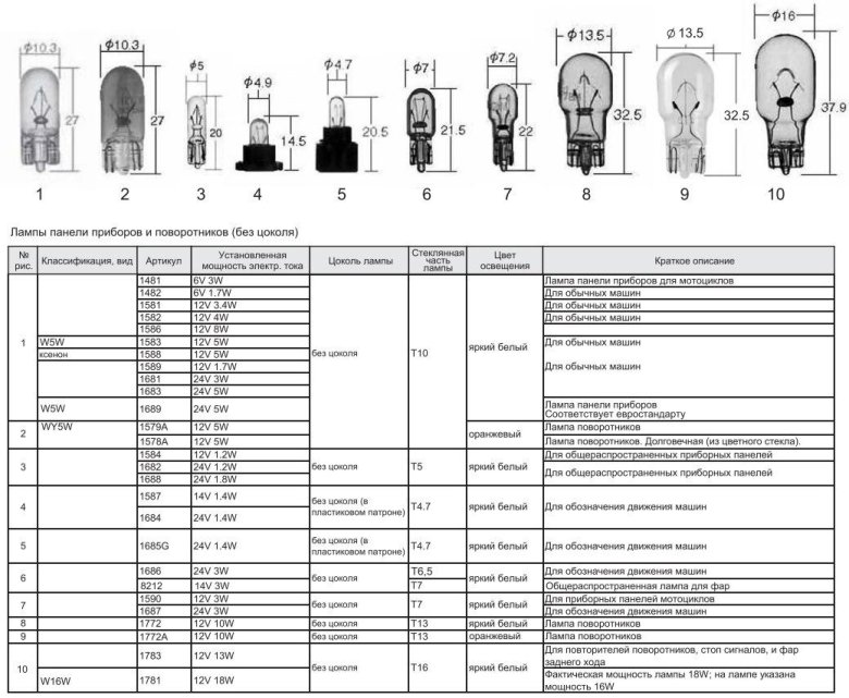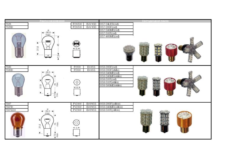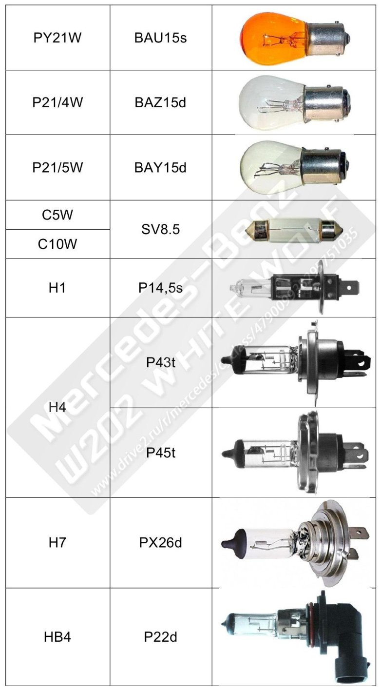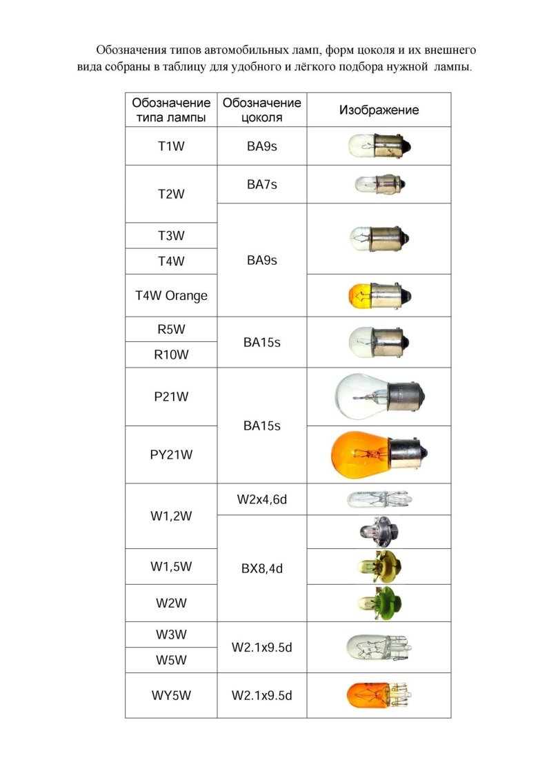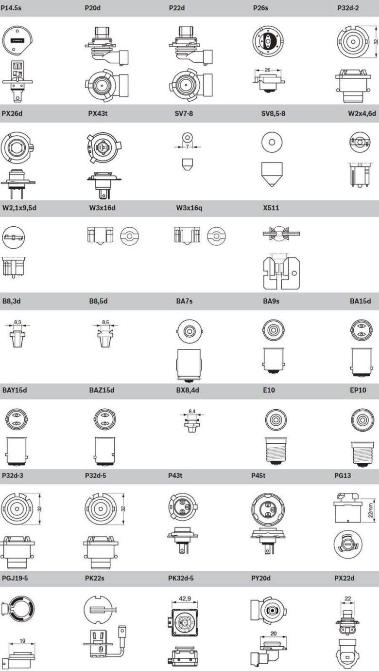 Цоколь автомобильных ламп таблица